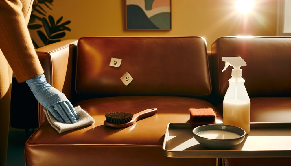 Before tackling spots, establish a gentle, finish-safe routine that guarantees grit from abrading the grain. Begin with dry microfiber brushing, lifting dust from seams and tufting without scuffing topcoat. Vacuum with a soft brush attachment, keeping the nozzle slightly off-surface. For routine soil, wipe with a barely damp, pH-neutral solution on a lint-free cloth; avoid overwetting edges and perforations. Blot, don’t rub. For fresh spills, isolate the area, test, then apply a mild soap solution; follow with light vinegar rinsing (1:20) to neutralize residues, immediately drying with airflow. Document reactions by leather type—aniline, semi-aniline, or pigmented—to guarantee repeatable, safe care.
